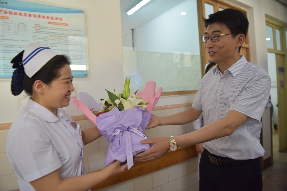 院領(lǐng)導一行把飽含著(zhù)醫院溫暖和關(guān)愛(ài)的鮮花、蛋糕送到臨床一線(xiàn)護理人員手中,每到一處,院領(lǐng)導都與護士們親切握手交談,這鮮花和蛋糕既帶來(lái)了節日祝福也帶來(lái)了醫院領(lǐng)導對護理人員最真摯的愛(ài)護。