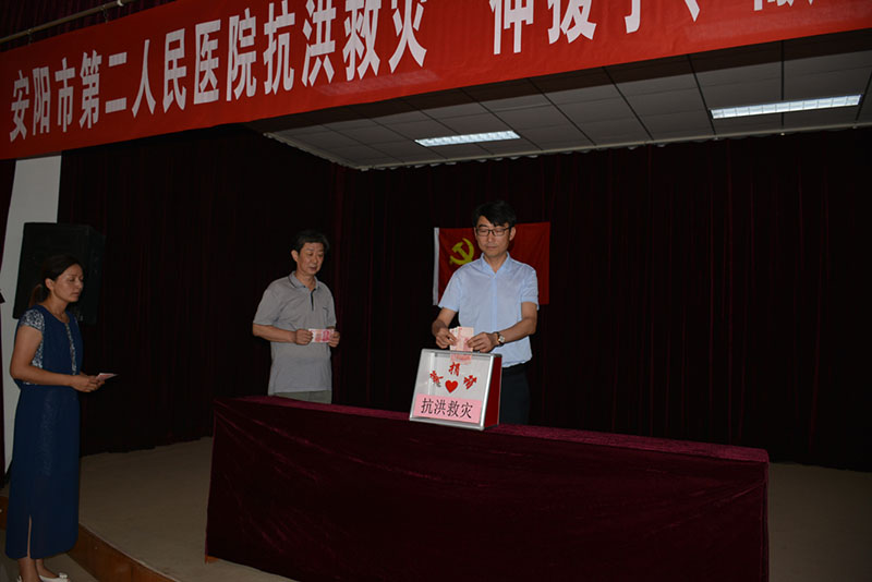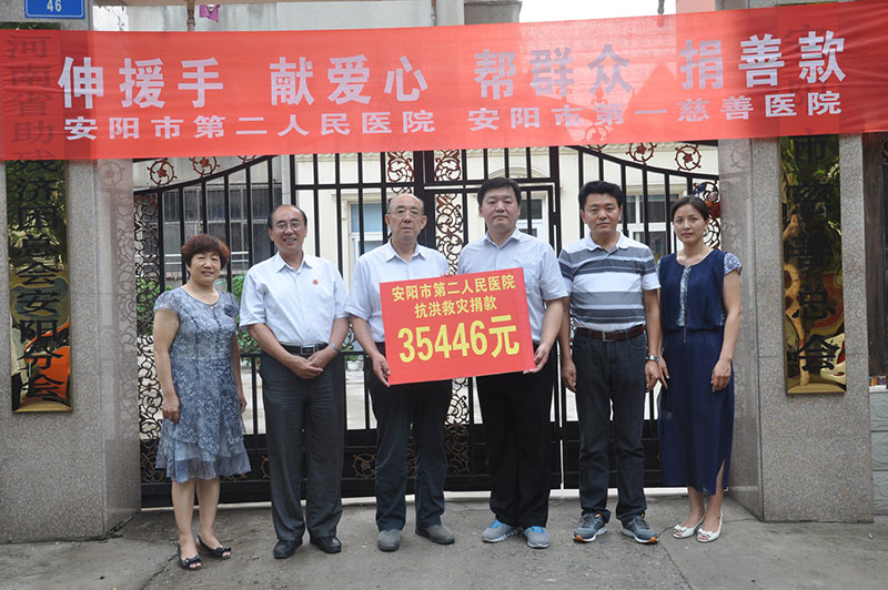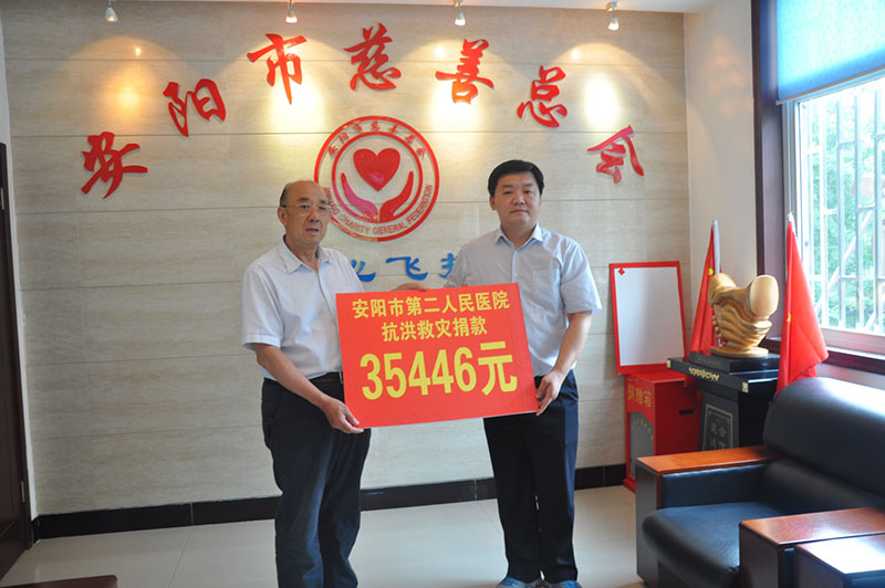 心系災區,大愛(ài)無(wú)疆! 7月27日上午10時(shí),我院黨委在三樓大會(huì )議室組織開(kāi)展抗洪救災“伸援手、獻愛(ài)心”募捐活動(dòng)。號召黨員干部團結一心,發(fā)揮黨員模范帶頭作用。醫院廣大黨員干部職工積極參加此次募捐,為災區的重建貢獻自己的力量,此次募捐的善款合計35446元人民幣。下午5點(diǎn),醫院黨委書(shū)記盧占軍、工會(huì )主席劉艷芬等一行代表醫院將此次募捐的善款送至安陽(yáng)市慈善總會(huì )。慈善總會(huì )副會(huì )長(cháng)王建邦、副會(huì )長(cháng)劉付貴、秘書(shū)長(cháng)陳新升一同接受此筆捐款,并對市二院在抗洪救災中所做的工作表示高度贊揚和認可。