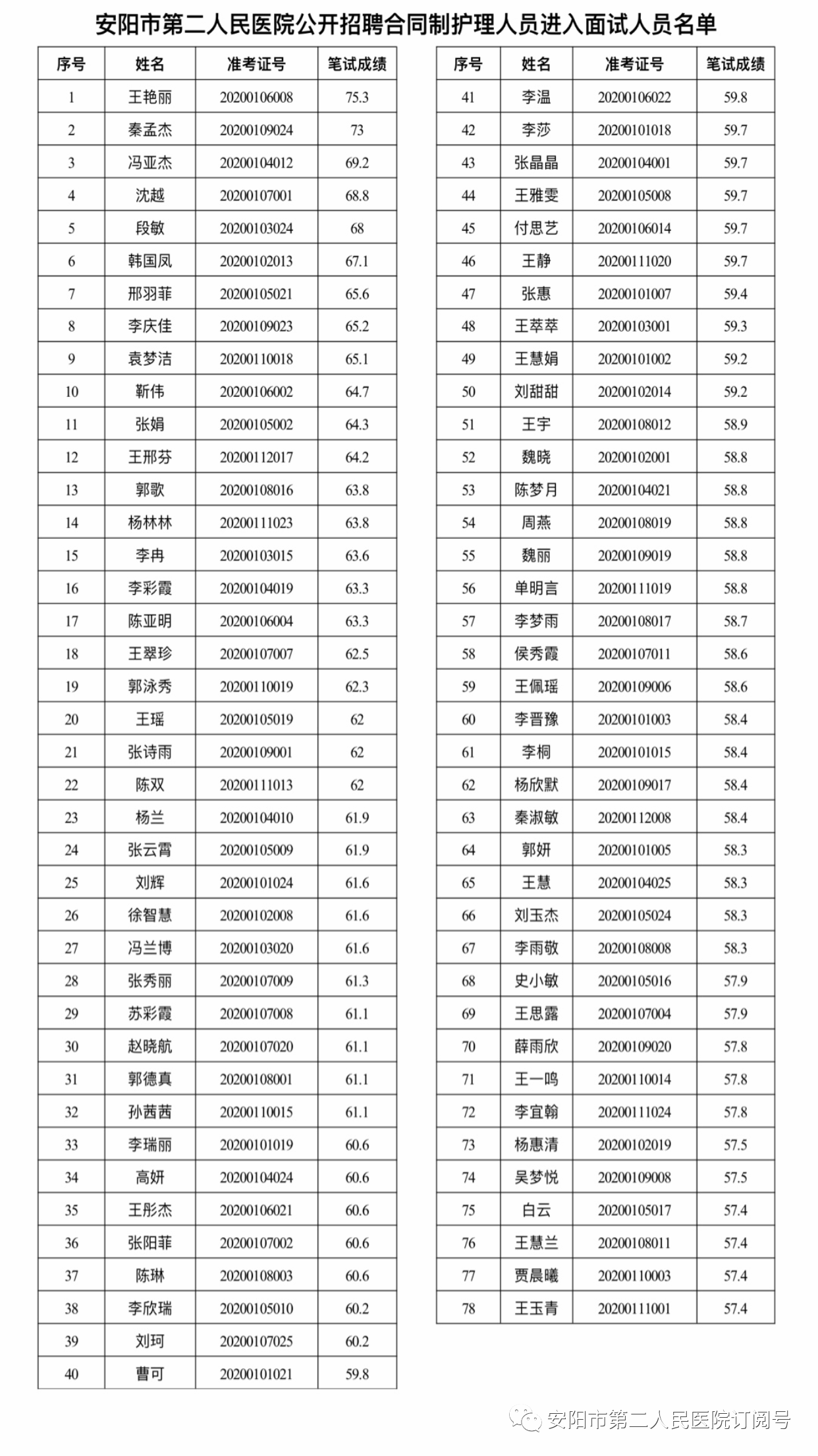 安陽(yáng)市第二人民醫院 2020年公開(kāi)招聘合同制護理人員進(jìn)入面試人員名單公示
