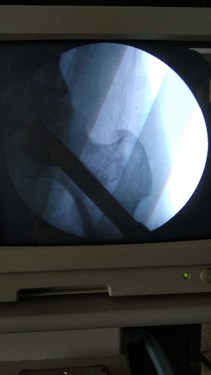 患者劉某,男,52歲,因雙側股骨頭無(wú)菌性壞死1年收住我科。何光亮主任在詳細檢查病人后,結合患者影像學(xué)資料,準確判斷患者屬于股骨頭壞死賓夕法尼亞分期Ib期,處于可以采取保髖治療的階段,在充分與患者及家屬溝通病情后,決定采用人工陶瓷棒技術(shù)進(jìn)行治療。人工陶瓷棒技術(shù)是目前保髖治療手段中的前沿技術(shù),需要醫生對骨壞死分期把握準確,且陶瓷棒技術(shù)屬于微創(chuàng )技術(shù),手術(shù)切口僅2cm,術(shù)中需多次透視以確保器械的精準定位和植入的完美放置。7月8日上午,我科在麻醉科和影像科的配合下,成功為患者進(jìn)行了左側壞死股骨頭的大面積減壓和陶瓷棒植入,術(shù)后麻醉復蘇后,患者即感覺(jué)疼痛的癥狀有明顯緩解,目前患者在進(jìn)一步康復中。