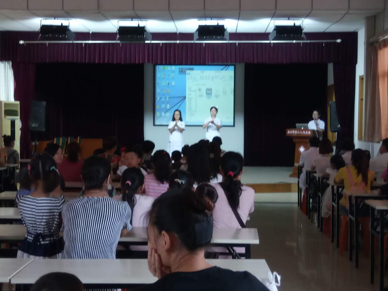 在“洗手歌”歡快的歌聲里,我們開(kāi)始了今天的手衛生知識宣傳,隨著(zhù)世界衛生組織手衛生宣傳片的播放,小朋友和家長(cháng)們不再交頭接耳,會(huì )場(chǎng)很快的安靜下來(lái)。之后,醫院感染管理科方姐姐及健康體檢科鮑姐姐來(lái)到講臺,詳細講解并演示了正確的7步洗手法。