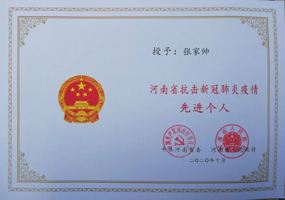 喜訊| 我院張家帥同志榮獲“河南省抗擊新冠肺炎疫情先進(jìn)個(gè)人”榮譽(yù)稱(chēng)號